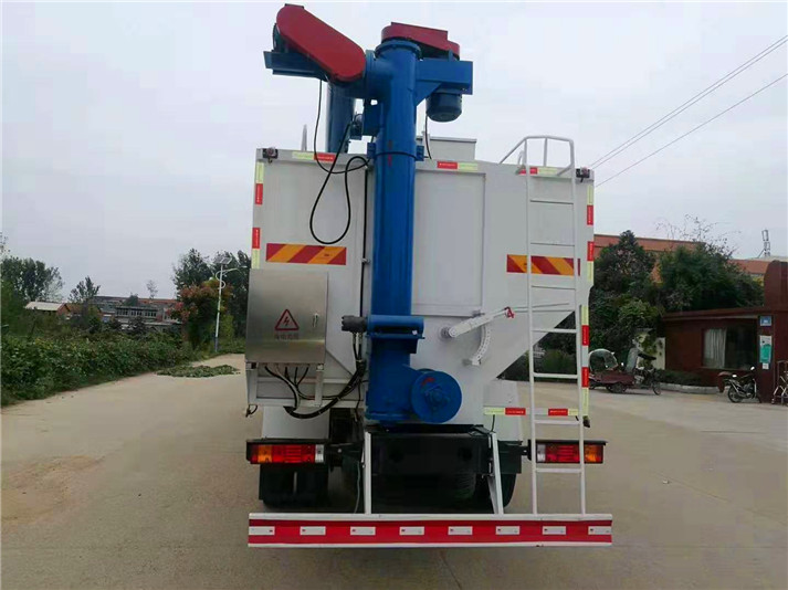 上裝罐體:罐體材質(zhì)采用4mm優(yōu)質(zhì)碳鋼板,整車3條絞龍,由3個(gè)5.5KW電機(jī)380V外接電源帶動(dòng),頂部絞龍用液壓控制舉升,可左右旋轉(zhuǎn)180°。罐體內(nèi)分為肆個(gè)倉,可以獨(dú)立控制各分倉卸料順序和速度。