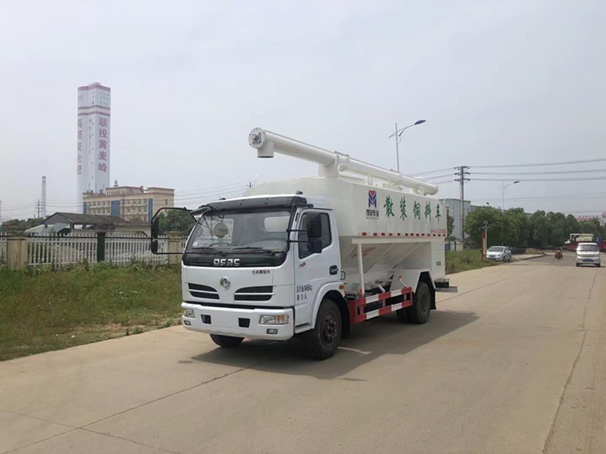 散裝飼料運(yùn)輸車(chē),散裝飼料車(chē)的飼料罐架設(shè)在卡車(chē)的底盤(pán)上,罐頂開(kāi)有進(jìn)料口.頂部的一根螺旋輸送卸料管(俗稱(chēng)卸料絞龍)則可自由回轉(zhuǎn)和抬升,抬升的仰角可達(dá)60度。運(yùn)輸時(shí),頂部的螺旋管平臥在罐頂;卸料時(shí)則抬起,使管端的出料口與畜禽飼養(yǎng)場(chǎng)貯料罐頂部的進(jìn)料門(mén)相接,駕駛室內(nèi)裝有操縱裝置(操縱裝置也可裝置在罐體尾部),卸料時(shí)通過(guò)車(chē)底的動(dòng)力輸出軸和減速器來(lái)驅(qū)動(dòng)螺旋,以完成卸料。